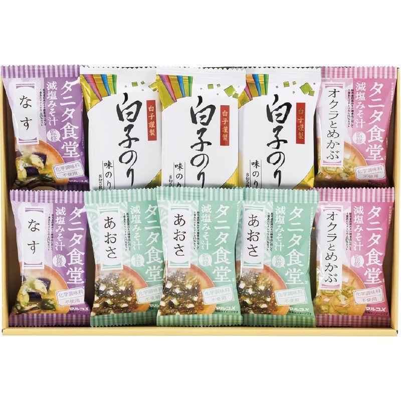• 商品内容:タニタ食堂監修減塩みそ汁(あおさ)・白子のり味のり(8切5枚)×各3、タニタ食堂監修減塩みそ汁(なす・オクラとめかぶ)×各2