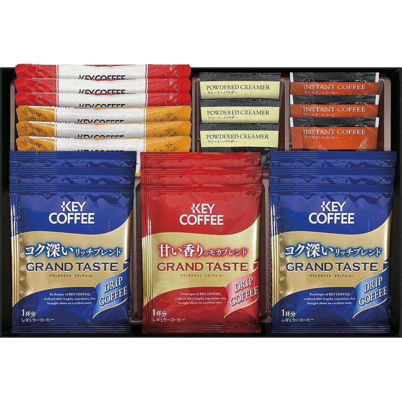 豊かなコクのリッチブレンド、やわらかな味わいに仕上げた甘い香りのモカブレンド、スティックタイプのカフェオレとカフェモカなどのキーコーヒーのセレクションセットです