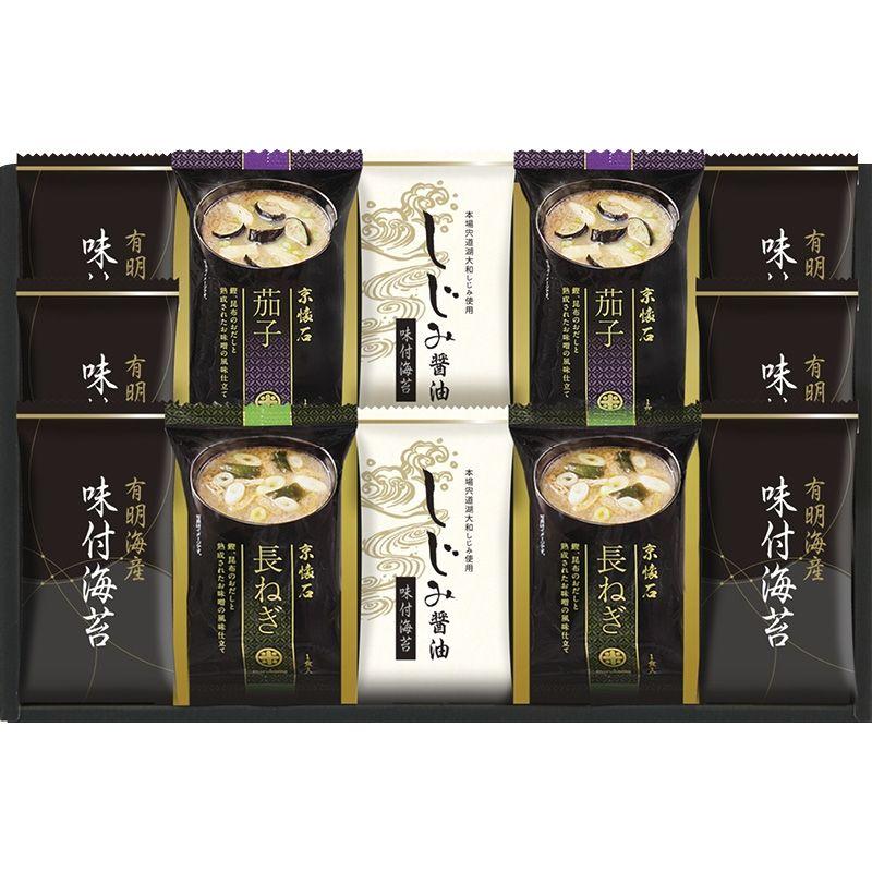 • 商品内容:有明海産味付海苔(8切8枚)×6、しじみ醤油味付海苔(8切8枚)・マルコメ京懐石長ねぎのおみそ汁(15.7g)・マルコメ京懐石茄子のおみそ汁(11.5g)×各2