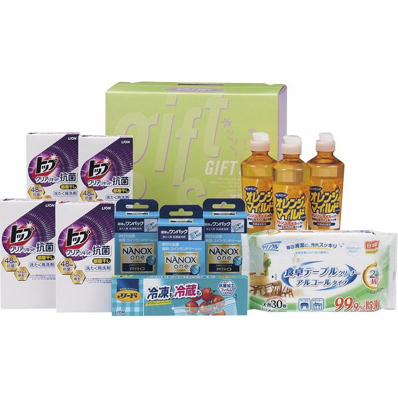 • 商品内容:ライオントップクリアリキッド抗菌(25g×2袋)×4、オレンジマイルドコンパクト(270ml)・ライオンNANOX one PROワンパック(10g×6袋)×各3、クリンクル食卓テーブルふきん(30枚入)・ライオンリード冷凍も冷蔵も新鮮保存バッグ(タイ)(S3枚)×各1