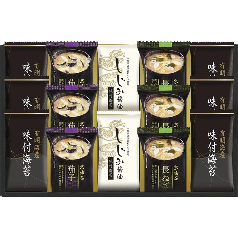 • 商品内容:有明海産味付海苔(8切8枚)×6、マルコメ京懐石長ねぎのおみそ汁(15.7g)・マルコメ京懐石茄子のおみそ汁(11.5g)×各3、しじみ醤油味付海苔(8切8枚)×2