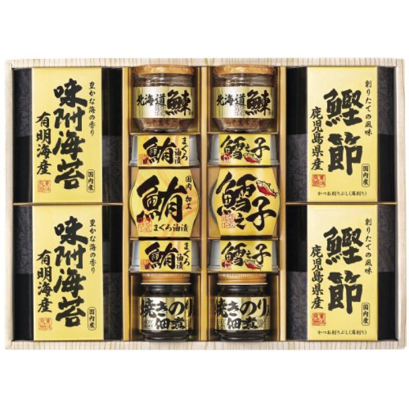 • 商品内容:まぐろ油漬け・鱈之子味付け(固形量45g)(各70g)×各3、焼きのり入佃煮(85g)・北海道産鰊フレーク(50g)・有明海産味附海苔(8切10枚入)・鹿児島県産鰹節(2g×3)×各2