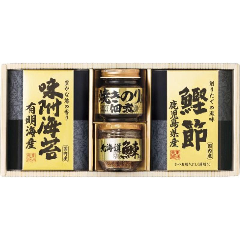 • 商品内容:焼きのり入佃煮(85g)・北海道産鰊フレーク(50g)・鹿児島県産鰹節(2g×3)・有明海産味附海苔(8切10枚入)×各1