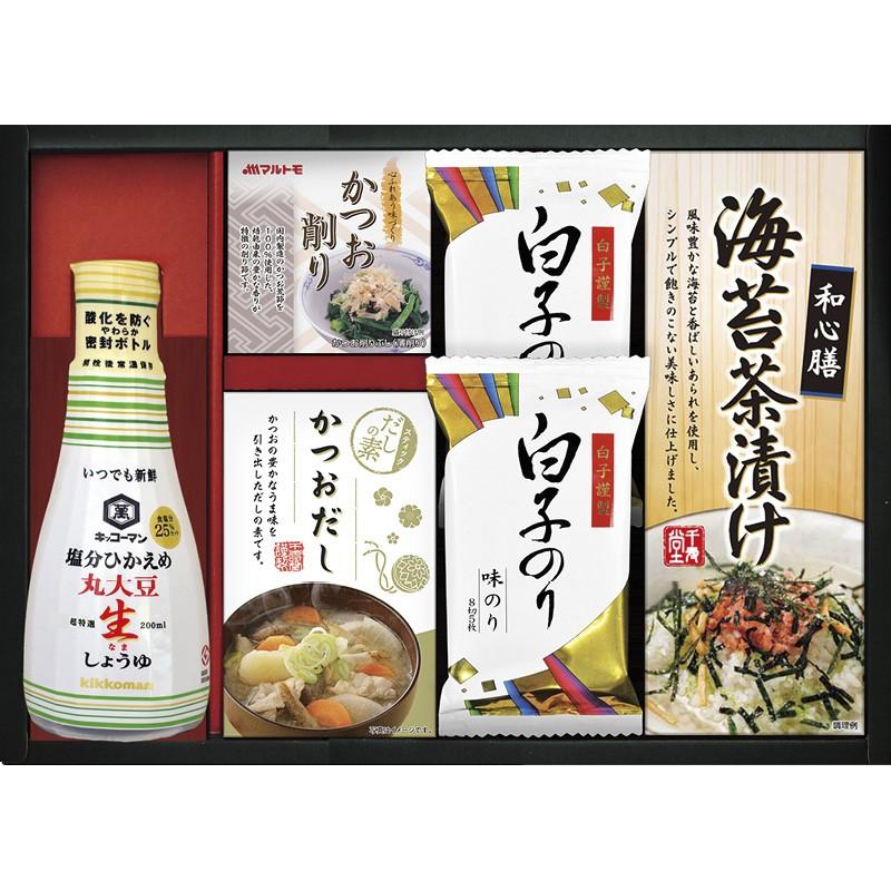 • 商品内容:白子のり味のり(8切5枚)×2、キッコーマン塩分ひかえめ丸大豆生しょうゆ(200ml)・海苔茶漬け(6g×5)・かね七かつおだし(4g×5)・マルトモかつおパック(0.7g×3)×各1