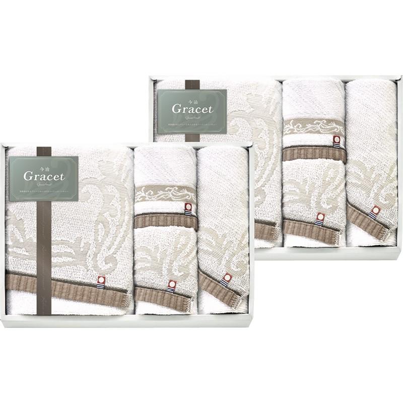 高級感のあるグレーとあたたかみのあるベージュを混ぜ合わせた、グレージュカラーのタオルセット。甘撚りの糸で織り上げ、ふんわりとした肌触りです。長い歴史の中で培われた今治のジャガード織で、ゆったりとしたオーナメント柄を繊細な曲線美で表現。優しいグラデーションにも、糸染めの業が光ります。